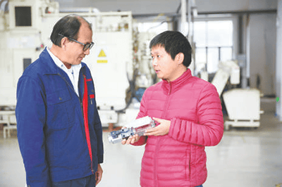 聚焦产学研协同立异,“科技副总”吴益根(左)取江西商蔚电液科技无限公司手艺开展营业交换,帮力出产手艺攻坚。